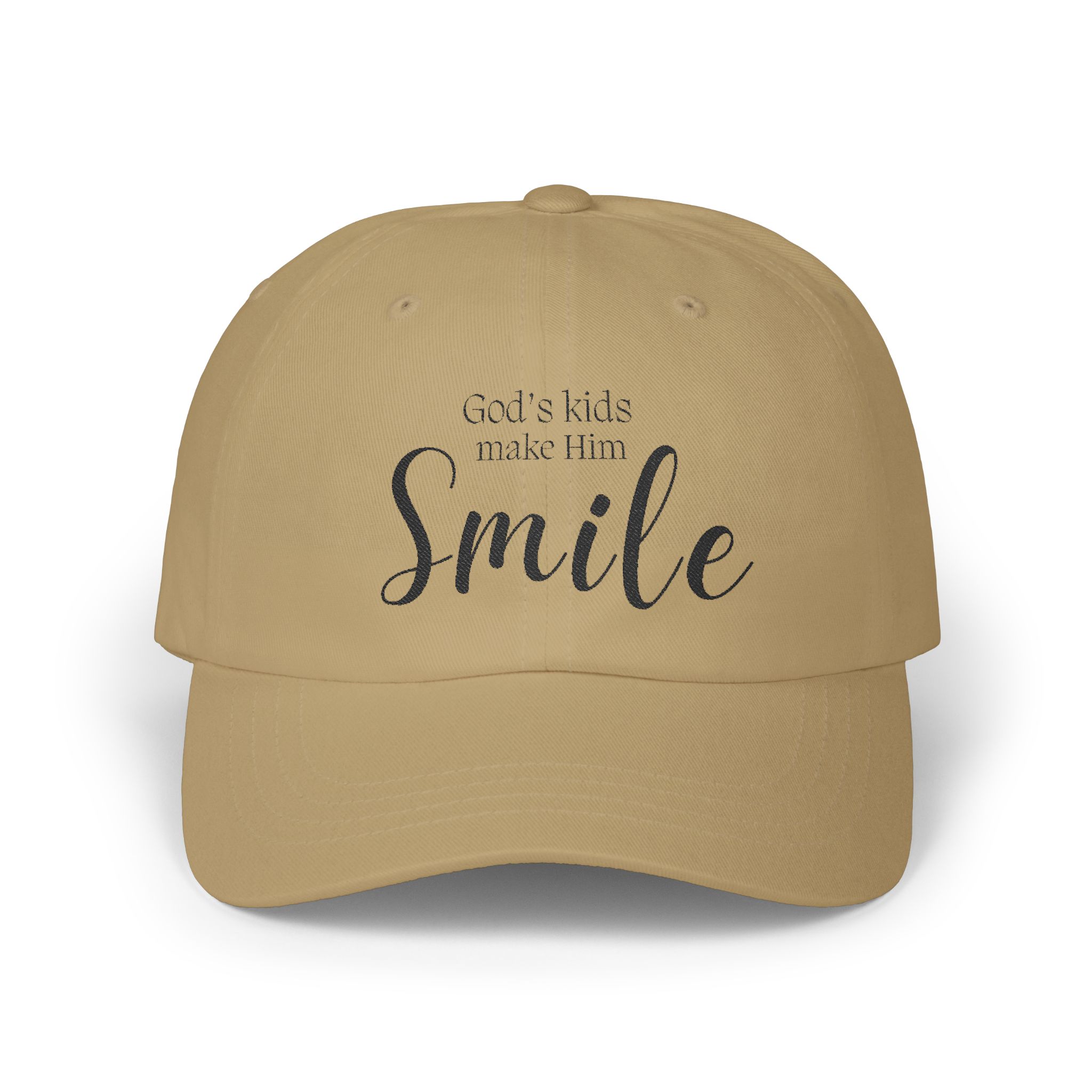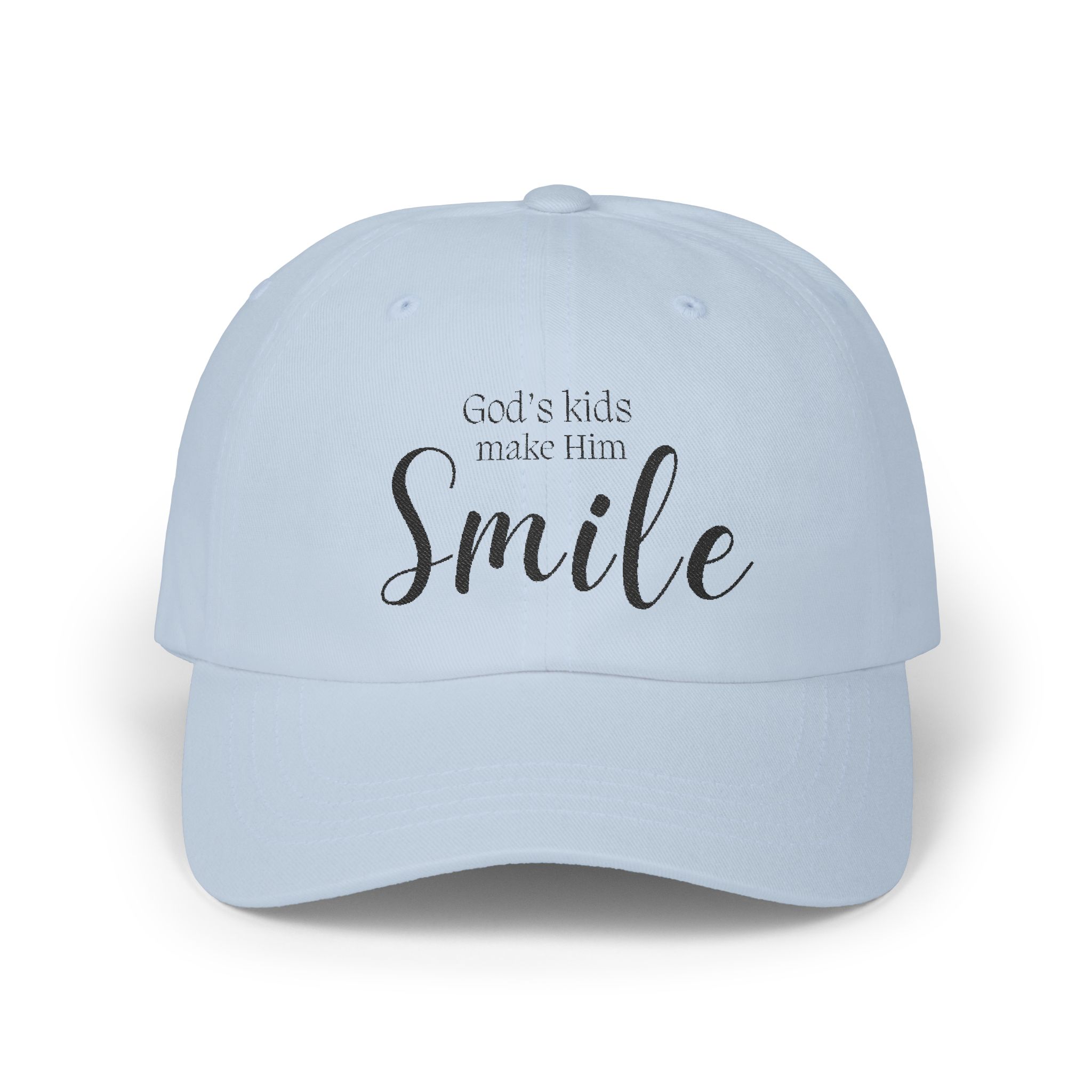 A stylish and comfortable cap featuring the phrase ‘God’s kids make him smile’. Perfect for everyday wear, this cap has a relaxed fit and adjustable snap closure for a perfect fit. It is suitable for adults and not recommended for ages 0-3. This cap is relevant for Christian holidays or everyday casual wear.